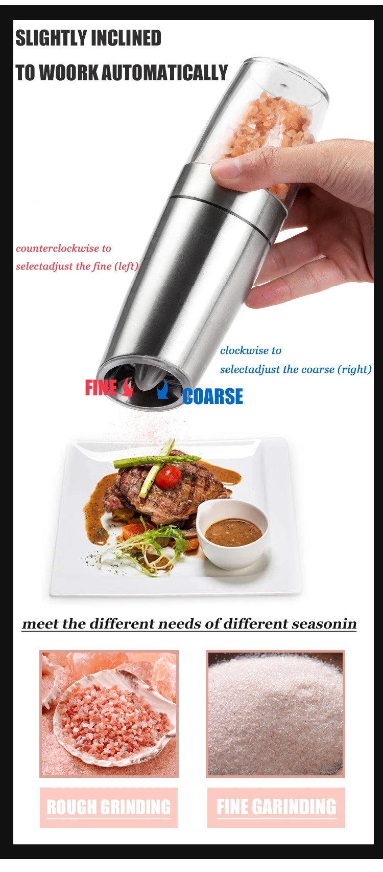 Moud le gros sel, les grains de poivre mais aussi les herbes et les épices. Fonctionne avec 4 piles AA (non fournies Grâce au moteur amélioré, le broyage est... Grande capacité : tout en conservant la fonction originale, nous avons augmenté la capacité du récipient transparent de 20,5 g à 46 g, ce qui vous permet d'ajouter plus facilement plus d'assaisonnement à la fois. Choisissez parmi 6 réglages de grossièreté, de fin à grossier, pour correspondre à votre style de cuisine, qu'il s'agisse de steak, de salade, de soupe ou de pâtes. Lot De 2 Moulins à Poivre Et Sel électriques Rechargeables Moulin à Poivre Electrique Grande Capacité Améliorée] Ensemble De Moulins à Sel Et Moulin A Poivre électrique Darty L'ensemble de moulins à sel et poivre électriques TOMEEM dispose d'une charge rapide de type C, vous permettant de moudre plus de 60 g d'épices sur une seule charge. Soutenu par une garantie de satisfaction à 100 % et une garantie supplémentaire de 6 mois pour un achat sans souci. Cadeau idéal pour les amateurs de cuisine : joliment emballé et polyvalent, ce moulin à épices rechargeable est un excellent cadeau pour les chefs, les cuisiniers à domicile et les gourmets. Rechargeable et respectueux de l'environnement : plus de tracas de batterie. La lumière LED jaune douce s'allume automatiquement pour éclairer vos aliments, assurant un assaisonnement parfait même en cas de faible luminosité. Moulins à sel et à poivre électriques et rechargeables de Kalorik... C'est un ajout élégant à toute cuisine ou table à manger, idéal pour la cuisine quotidienne et pour recevoir des invités.