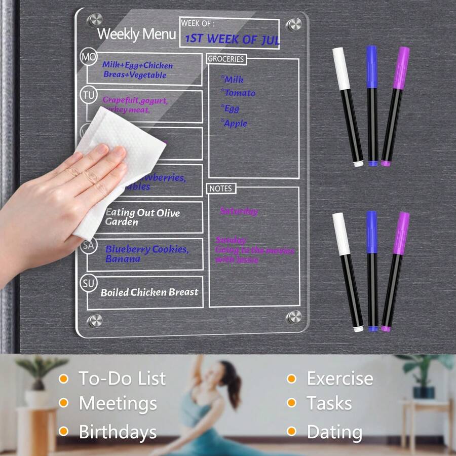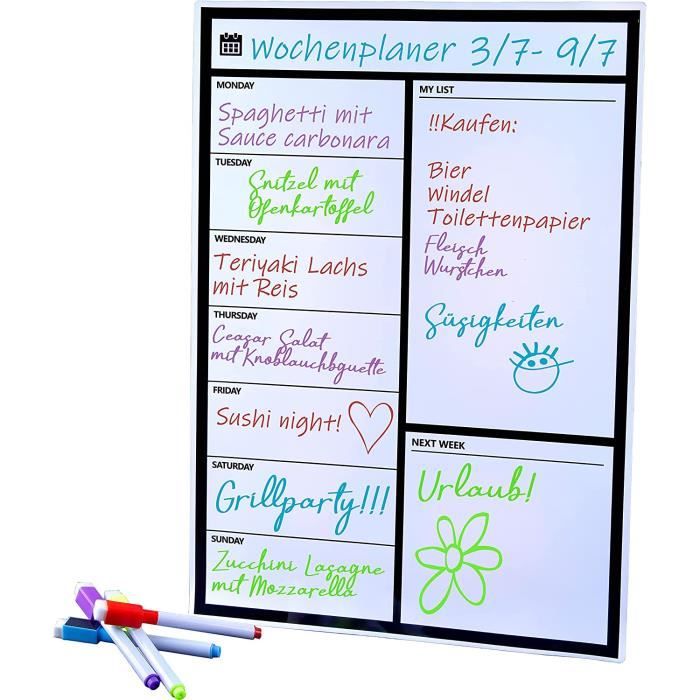 Ce que vous obtenez : ce planificateur de réfrigérateur en acrylique transparent s'adapte à n'importe quel style de décoration d'intérieur ou de cuisine, parfait pour tous ceux qui veulent organiser les choses. Planificateur hebdomadaire magnétique pour réfrigérateur : notre planificateur hebdomadaire magnétique de 39 x 24 cm est adapté à la plupart des réfrigérateurs. ) Facile à écrire et à effacer : comprend 6 stylos aquarelle pour une écriture fluide et une gomme magnétique + un chiffon pour un nettoyage sans fantômes. Commencé par le dimanche, avec un espace spacieux pour chaque jour de la semaine, vous pouvez enregistrer des listes de tâches, planifier des menus, listes de corvées et autres horaires chargés Calendrier Magnétique Frigo, Lot de 2 Tableau Transparent Effaçable Idéal pour : Planification des repas Listes de corvées familiales Rappels de tâches Horaires hebdomadaires Réflexions finales : Ce planificateur est un moyen élégant, fonctionnel et durable de garder votre maison organisée tout en se fondant parfaitement avec n'importe quel décor de cuisine. Une bonne qualité à prix abordable. Ce planificateur de réfrigérateur réutilisable ressemble à un fantastique outil d'organisation pour votre cuisine. Les aimants puissants et les fonctionnalités faciles à effacer en font un ajout facile à votre réfrigérateur. Acrylique transparent élégant : le calendrier magnétique pour réfrigérateur est fabriqué en acrylique transparent de haute qualité, durable et facile à nettoyer. Le lot comprend 6 marqueurs, 1 gomme et un porte-stylo, tous conçus pour apporter praticité et commodité à votre routine quotidienne. Planifiez et organisez... Veuillez les décoller avant utilisation Planning Magnétique Pour Enfants - Calendrier Scolaire - Effaçable... Aimants puissants améliorés : 4 aimants puissants, le tableau magnétique en acrylique peut être fermement fixé à n'importe quelle surface magnétique plane, de sorte qu'il ne tombera pas même si la porte du réfrigérateur est claquée. Il dispose de marqueurs colorés, lui donnant une belle apparence fluo. Kit tout compris - Livré avec : 1 agenda hebdomadaire en acrylique., 6 marqueurs colorés., 1 effaceur., 1 porte-stylo magnétique. Tableau Menu De La Semaine Tableau Magnétique Pour Réfrigérateur Calendrier Hebdomadaire Aimant En Tableau Menu Semaine Action (Décollez le film protecteur avant utilisation.