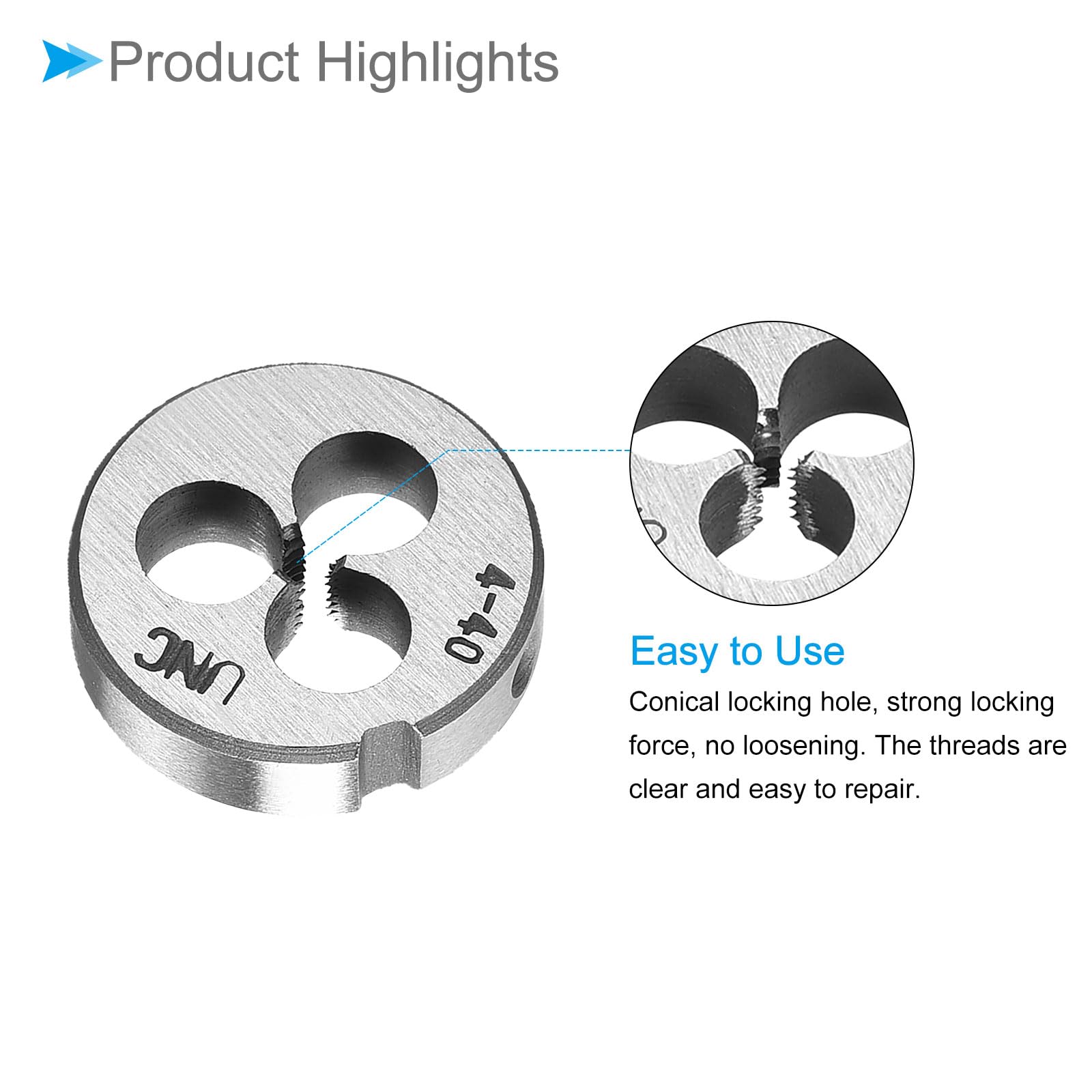 --- Avec la taille de la filière gravée sur la surface, il est facile d'identifier la filière correcte dont vous avez besoin. uxcell Lot de 6 tiges entièreent filetées 8 x 90 en acier... Filière Ronde En Pouce 9/16" UNC 12 HSS. Inversez la filière tous les 1/4 à 1/2 tour pour faciliter l'évacuation des copeaux par le trou de copeaux. ★ Facilité d'utilisation --- L'utilisation de la filière est simple : il suffit d'aligner la rainure de positionnement avec la vis de fixation au milieu de la clé à filière et de serrer. Cette fonctionnalité vous fait gagner du temps et vous permet de trouver facilement la taille dont vous avez besoin, en vous assurant d'avoir l'outil adéquat à portée de main pour des tâches de filetage efficaces et précises. Que vous ayez besoin de réparer des tuyaux, des planches ou des machines, nos filières rondes sont un choix fiable. Pour assurer des performances optimales et éviter d'endommager les dents de la filière, il est recommandé d'utiliser un diamètre de barre légèrement inférieur (environ 0,05mm-0,15mm) au diamètre nominal du filetage requis. ★ Filière ronde --- Taille du filetage : 4#-40 UNC ; diamètre extérieur (OD) : 0,8 pouce ; épaisseur : 5mm / 0,2 pouce ; matériau : acier allié. ★ Acier rapide (HSS) --- Fabriquée en acier rapide (HSS) de haute dureté et résistant à l'usure, la filière est idéale pour refaire des filetages existants dans des matériaux durs tels que le métal ou pour créer de nouveaux filetages dans des matériaux plus souples comme le plastique. Filière 4 40 Unc CoCud Filière Ronde, 4#-40 UNC, En Acier Allié Pour Filetage Filière Filetage 4 40 Pouces Plaque de montage ronde 4 pièces avec filetage 3/8-16 UNC, plaque de... Filière Ronde En Pouce N°10 UNC 24 HSS - Taraud, filière en coffret et