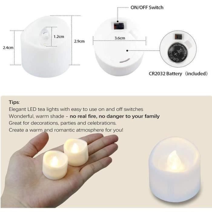 Tout d'abord, vous devez allumer l'interrupteur « ON » de la bougie. Lanterne LED - Lunartec - Noir - Effet flamme vacillante - Lot de 2... La mèche ne brûle pas et la cire ne fond pas. Bougie Led Blanche Bougie LED Flamme Vacillante Lot De 3, Bougies à Piles En Verre Avec Télécommande Et Minuteur Bougie Pile Il ne laissera pas de taches sombres sur le mur, même si les bougies sont utilisées tous les jours. KooPower est une entreprise professionnelle spécialisée dans l'éclairage LED et l'électronique grand public de la marque KooPower. Parfait pour Noël, mariage, fête, festival, jardin, cuisine, etc. Le kit de bougies KooPower à piles peut non seulement être utilisé à l'intérieur et à l'extérieur, mais également éclairer votre maison et votre jardin la nuit et décorer votre maison et votre jardin. Vos amis et votre famille seront surpris ! Télécommande et fonction minuterie : utilisation simple et confortable. Lorsque les piles AA longue durée sont vides, vous pouvez facilement en insérer une nouvelle. Yeelida 3-Mèches 15x15cm Grandes Bougies LED sans flamme avec Chaque bougie fonctionne avec 2 piles AA (non fournies). Vous pouvez choisir entre une minuterie 2h/4h/6h/8h ainsi que des options d'éclairage statiques ou vacillantes et des niveaux de luminosité. Koopower Lot de 12 bougies chauffe-plat LED sans flamme vacillante réalistes à piles au design ondulé pour mariages, festivals, dîners, Pâques, fête, etc. 3,6 x... Ensuite, retirez la plaque d'isolation de la télécommande. Cadeaux et décorations de table pour dîners, bougies en cire véritable, décoration de maison. Nous utilisons une mèche noire pour simuler la combustion d'une vraie bougie, et la longueur de la mèche est réglable. Décoration parfaite : émet une lumière jaune chaude et douce dans l'obscurité pour créer une atmosphère romantique et confortable ; idéal pour la fête des mères, anniversaire, Noël, Saint-Valentin, fêtes, vacances, maison, bar, hôtel, mariage.