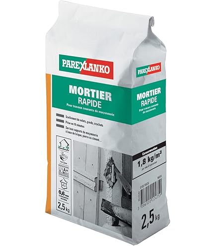 Il convient sur scellement rapide (gonds, pattes d'encrage, garde corps), fixation des bâtis de porte, chassis de fenêtre, calage de piquets, de poteaux, clôtures, montage de mur et sur des petites réparations (trous, saignées., ., ., ). Sans retrait : ne creuse pas, ne fissure pas ; Résiste à la corrosion ; Idéal en milieu humide (bassin, cuve, cave., ., ., ) Mortier de montage prêt à gâcher à utiliser au sol ou au mur en intérieur comme en extérieur Prise Sol Bostik – Mortier De Montage Rapide – Sol Et Mur – Intérieur Et Extérieur 1,5 Kg Mortier Béton 5 Kg Achetez Mortier de montage pour parpaings et briques intérieur et extérieur - Sac de 30 Kg de la marque PRB.Idéal pour . Couleur Noir Hauteur du produit 1,00 cm Largeur du produit 1,00 cm Longueur 1,00 nm Type de produit Enduit Caractéristiques complémentaires Prise rapide en 10 minutes, sans retrait, adapté pour sol et mur, intérieur et extérieur, très bonne résistance à la corrosion, adapté pour milieux humides Application produit de bricolage Fixation, scellement, calage, montage de mur, réparation... Sa formule garantit une prise rapide en 10 minutes, un résultat sans retrait et qui ne creuse ni ne se fissure. Mortier Bâtard | DIY BOSTIK Contenu de la livraison : 1x Sac de Mortier Rapide Bostik, Couleur : Beige, Poids : 1,5 kg, Consommation 20 kg/m²/cm, Pays de Fabrication : France, Code : 30602264 Prise rapide (10 minutes) ; Très bonne résistance atteinte en 4 heures ; Séchage complet en 24 h ; Performances mécaniques optimales après 28 jours Mortier Rapide Bostik – Fixation rapide et durable