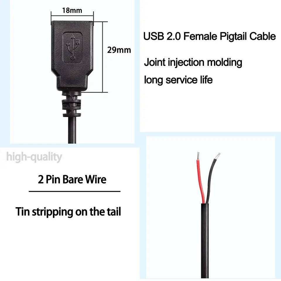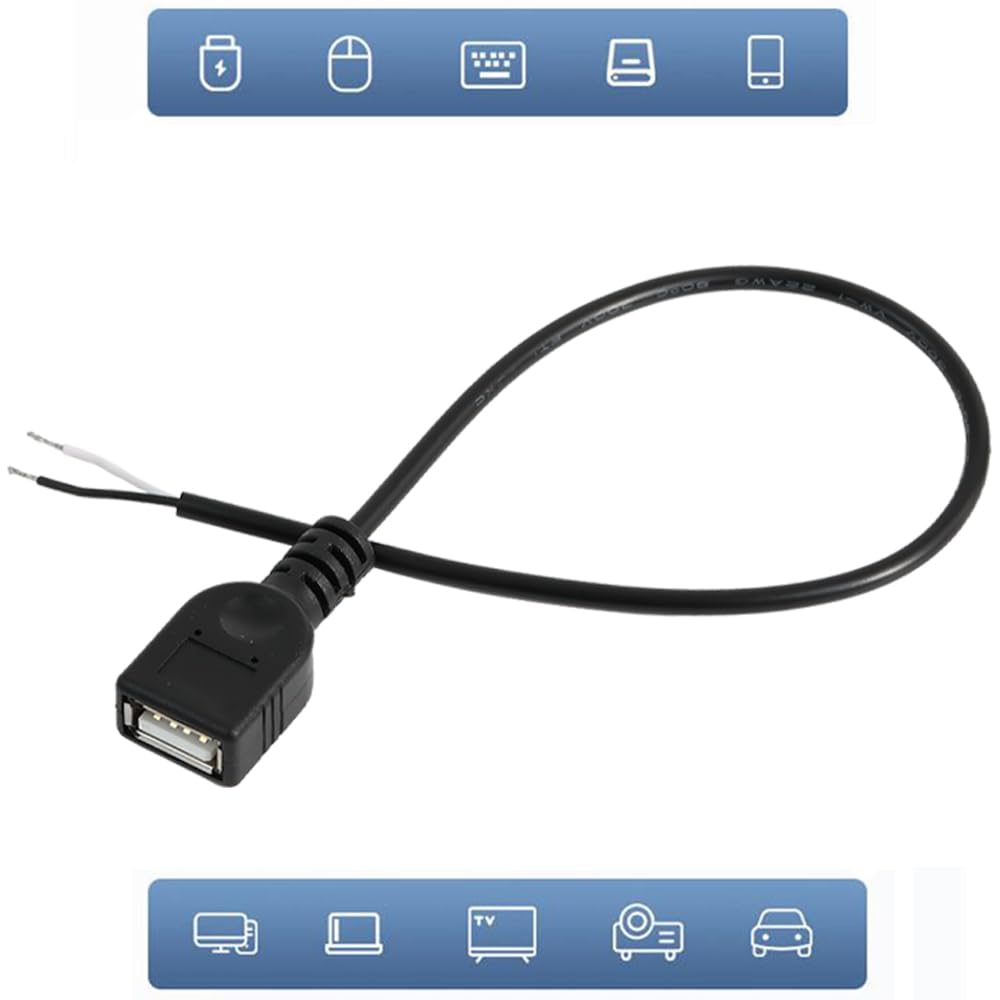 Ce Câble Pigtail USB est idéal pour la réparation et le remplacement DIY d’équipements de charge pour petits ventilateurs, petits appareils ménagers, bandes LED, adaptateurs d’alimentation, prises de charge, cartes de prises USB, cartes de circuit imprimé et divers petits appareils électriques. B USB 3.0-Câble d'extension USB 3.0, 1 mâle vers 2 femelles-1 femelle... Ce câble de bonne qualité dispose d'une part d'un connecteur PH 2.0mm 4 pôles (2 rangées) et d'autre part de 4 fils dénudés (2x rouges, 2x noirs). Avantages: Le fil utilise du cuivre non-allié à l’intérieur pour une résistance plus faible et une conductivité plus élevée, et la couche d’isolation en PVC externe offre une excellente isolation et résistance à la chaleur. Connectez l’extrémité du connecteur USB à une source d’alimentation USB. Il convient aux projets de hobby, aux installations domotiques et autres applications DIY. InstructionsConnectez l’extrémité étamée du fil à l’appareil ou au composant que vous souhaitez alimenter ou charger. Instructions: Connectez l’extrémité étamée du fil à l’appareil ou au composant que vous souhaitez alimenter ou charger. SpécificationsCouleur: NoirMatériau: PVC, CuivreTaille du fil: 22 AWGTension nominale: 5VCourant nominal: 3ALongueur du fil: 0., 3 m / 1 FtListe d’emballage: 3pcs x Câble Pigtail USBAvantagesLe fil utilise du cuivre non-allié à l’intérieur pour une résistance plus faible et une conductivité plus élevée, et la couche d’isolation en PVC externe offre une excellente isolation et résistance à la chaleur. NOTE: Pour assurer une utilisation sûre, évitez de surcharger le cordon d’extension avec des appareils dépassant sa tension et son courant nominal indiqués dans nos spécifications. Jienk 5Pcs 1Ft 30CM 22AWG USB 2.0 Female 2Pin Pigtail Cable, 5V USB Type A 2Core Bare Wire Open End Extension Cable For DIY Repair Câble XH 2.54mm Femelle vers Fils Nus 1 Connecteur 3 Pôles 20cm Noir... Câble XH 2.54mm Femelle vers Fils Nus 1 Connecteur 3 Pôles 20cm Noir