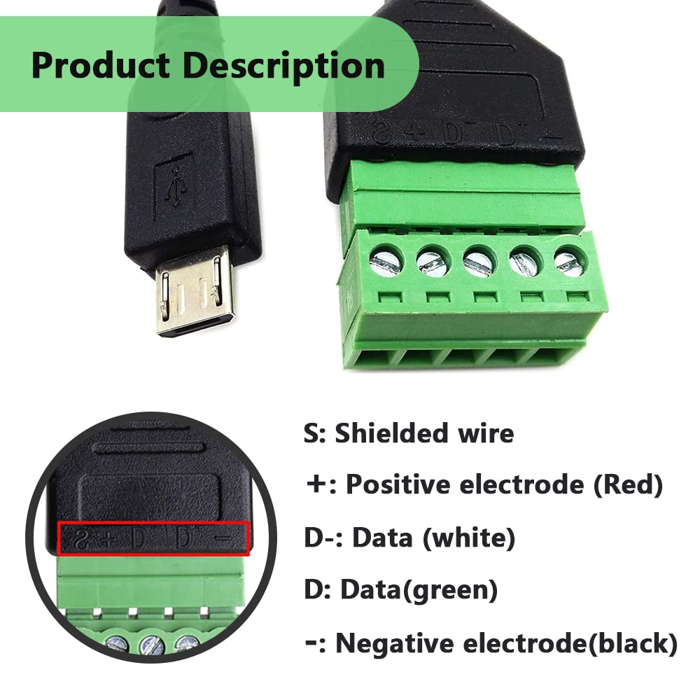 Équipements applicables : ordinateurs, téléphones portables, tablettes et autres périphériques d'interface de type C CONTACT CUIVRE POUR Connexion Fiable 2 Broches DIN HiFi Haut-Parleur Prise Set EUR 5,71... LEX Prise d'aviation 5 pièces Aviation prise connecteur mle femelle fil panneau puissance Utilisez un câble toronné ou solide et un petit tournevis pour créer des câbles personnalisés Prise Mâle Micro USB à 5 Broches Vis Bornier Connecteur Adaptateur Câble USB Borne Prise Avec Connecteur De Blindage Petite taille, plug and play, structure compacte, poids léger, câblage pratique et facile. Longueur : 30 cm ; Couleur : Vert Noir Argenté ; Matériau Description : Câble d'extension de connexion sans soudure avec connecteur USB 2., 0 (femelle) Bornier à vis sans soudure enfichable à 5 broches Aucune soudure requise ! Câble d'extension de connexion sans soudure avec connecteur USB 2., 0 (femelle)