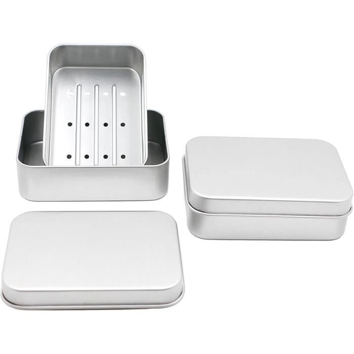 ✨ Caractéristiques : Matériel: aluminium Quantité : 2 pièces., Poids : 80 g. Le réservoir ne convient pas pour le stockage de liquides. Porte-savon de voyage portable : le porte-savon carré mesure 79 mm x 79 mm x 38 mm, léger et portable, peu encombrant, parfait pour le transport dans le sac à main et adapté pour les voyages. La version carrée (9,6x6,8x3 cm) et la ronde (7,7x3,2 cm) sont super pratiques pour ranger ton savon solide, que ce soit à la maison ou en voyage. L'aluminium... Lot de 2 petites boîtes à savon carrées et étanches en aluminium, boîte de rangement rectangulaire en métal sans plastique, boîte à savon argentée avec bac... Boite Savon Solide Boite A Savon Voyage Etanche Avec Couvercle Porte Avon Etanche Et Boîte à Savon Solide Dimensions : 79 x 79 x 38 mm., ✨ Remarque : 1., Ne pas utiliser de produits de nettoyage corrosifs pour le nettoyage., 2., Ne jamais rayer le porte-savon avec des objets tranchants., 3., Équipé d'un compartiment de drainage pour évacuer l'humidité., 4., Veuillez ouvrir le couvercle après utilisation et le laisser sécher rapidement., 5., Fabriqué en aluminium, robuste et durable, léger et portable, très adapté pour les voyages. Boîte à savon métallique, le compagnon de voyage idéal Ne jamais rayer le porte-savon avec des objets tranchants. Porte-savon en aluminium : le porte-savon est fabriqué en aluminium de haute qualité, qui ne rouille pas facilement, résistant à la corrosion, à l'eau et à l'humidité, robuste et durable et peut être réutilisé. Large application : la boîte à savon en aluminium peut être utilisée comme petite boîte de rangement, boîte à thé et boîte à bonbons pour stocker du shampooing solide, des bonbons, du chocolat, du thé, du savon, etc.