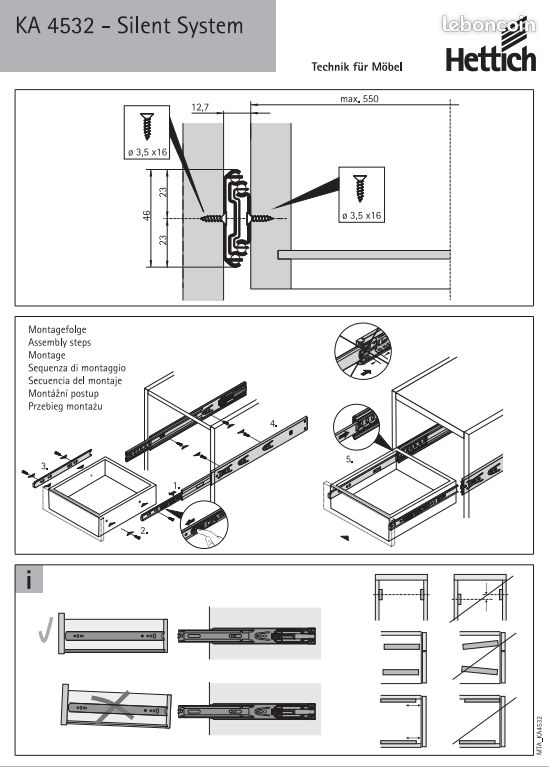 Soft Close – Extension complète , 550 mm Capacité de charge 25 kg Caoutchouc de frein empêchant d'ouverture automatique 450mm Kit Tiroir Métallique - Tiroir Coulissant Ultra Metal Box - Hauteur 86 MM Finition Grise. Comprend des côtés, des guides, des crochets Lot de 1 Coulisse de tiroir SOFT-CLOSE tiroir montage latéral H45 L-550 : : BricolagePolitique de retour Politique de retour Si vous n'êtes pas satisfait d'un produit que vous avez commandé auprès d' ou si celui-ci est défectueux ou endommagé, vous pouvez nous le retourner sous 30 jours suivant la date de livraison, et nous vous rembourserons ou remplacerons... Glissière De Tiroir Guide Tiroir Soft-Close 550 Mm Guide à Billes Coulisses Pour Tiroirs GTV Glissières de tiroir - 450 mm - Système de rails Soft-Close