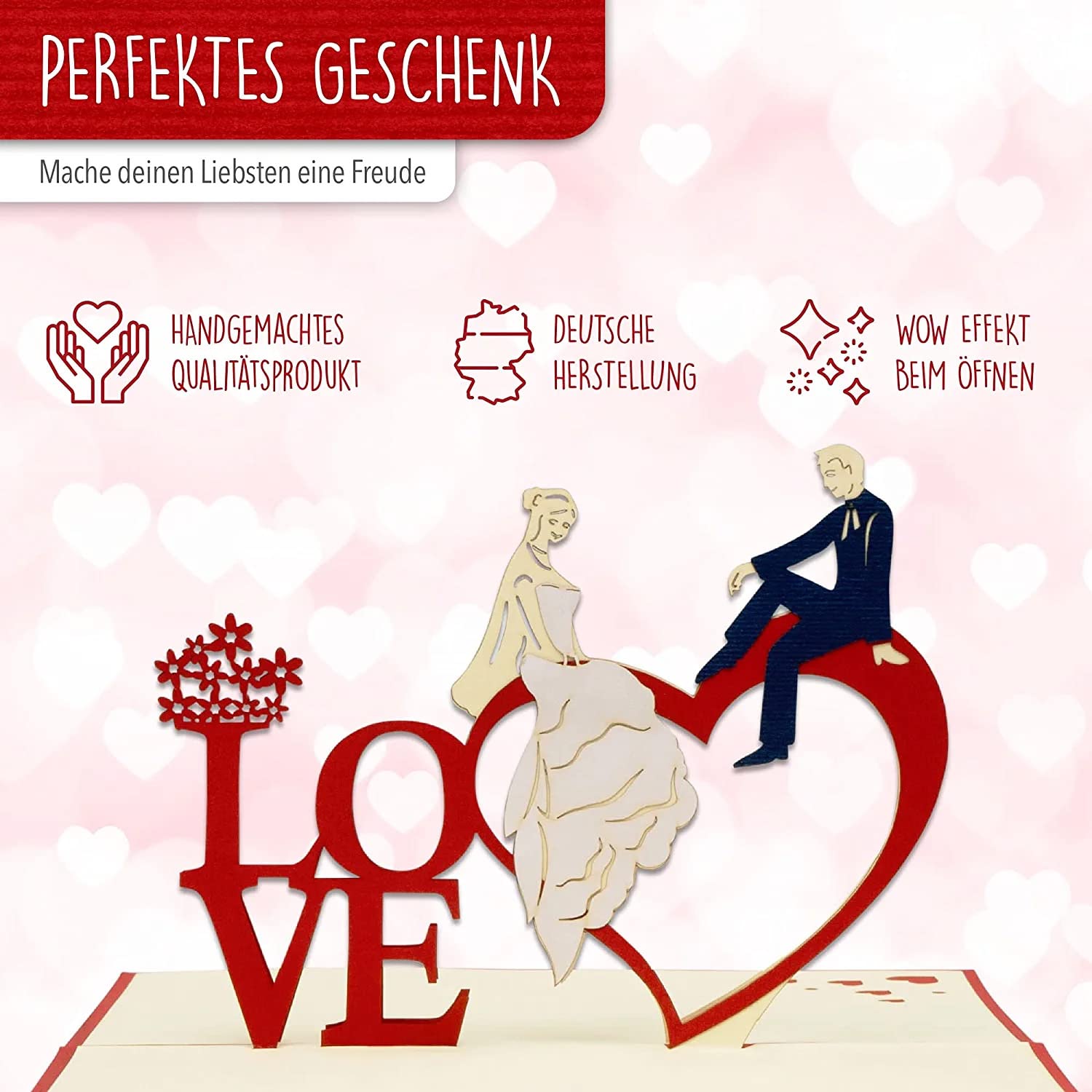 En papier japonais de qualité supérieure (Kishu Paper), cette carte élégante est fabriquée à la main. Vos destinataires devraient avoir plaisir et surprise avec leur cadeau et être surpris de ce qu'il y a ainsi. Grâce à la technique de pliage du papier, au mécanisme de pliage et à la mise en place de l'objet en 3 dimensions, vous pouvez ouvrir la carte plusieurs fois sans se coincer. 3D Belle Carte de Mariage Pop Up, Carte de Voeux de Mariage Faite à la Main Carte Pop-up pour L'IDÉE CADEAU IDÉALE : vous recevrez une carte pop-up 3D de 15 x 21 cm avec un encart pour votre message personnel, une enveloppe assortie ainsi qu'une housse... Carte Noel Amour LINPOPUP®, LIN17384, Carte POP UP - Carte De Voeux 3D Pour Mariage Fiançailles - Carte 3D Pliable Carte Mariage Lors de l'ouverture de la carte, le parc se déploie à l'intérieur de la carte en 3D. La carte est livrée avec une enveloppe assortie et une pochette en cellophane. La carte en carton coloré imprimée du supermarché n'est certainement pas juste pour cela et elle atterrit tôt ou tard dans la poubelle à vos destinataires et ne laisse plus aucun souvenir. Si vous souhaitez féliciter ou offrir un bon d'achat alors vous devez prendre cette carte pop-up Lin. Avec l'objet en 3 dimensions à l'intérieur « Park », cette carte LIN Pop Up n'est pas seulement une carte de vœux, mais aussi une petite œuvre d'art qui permet d'exprimer votre sentiment personnel de façon particulière.