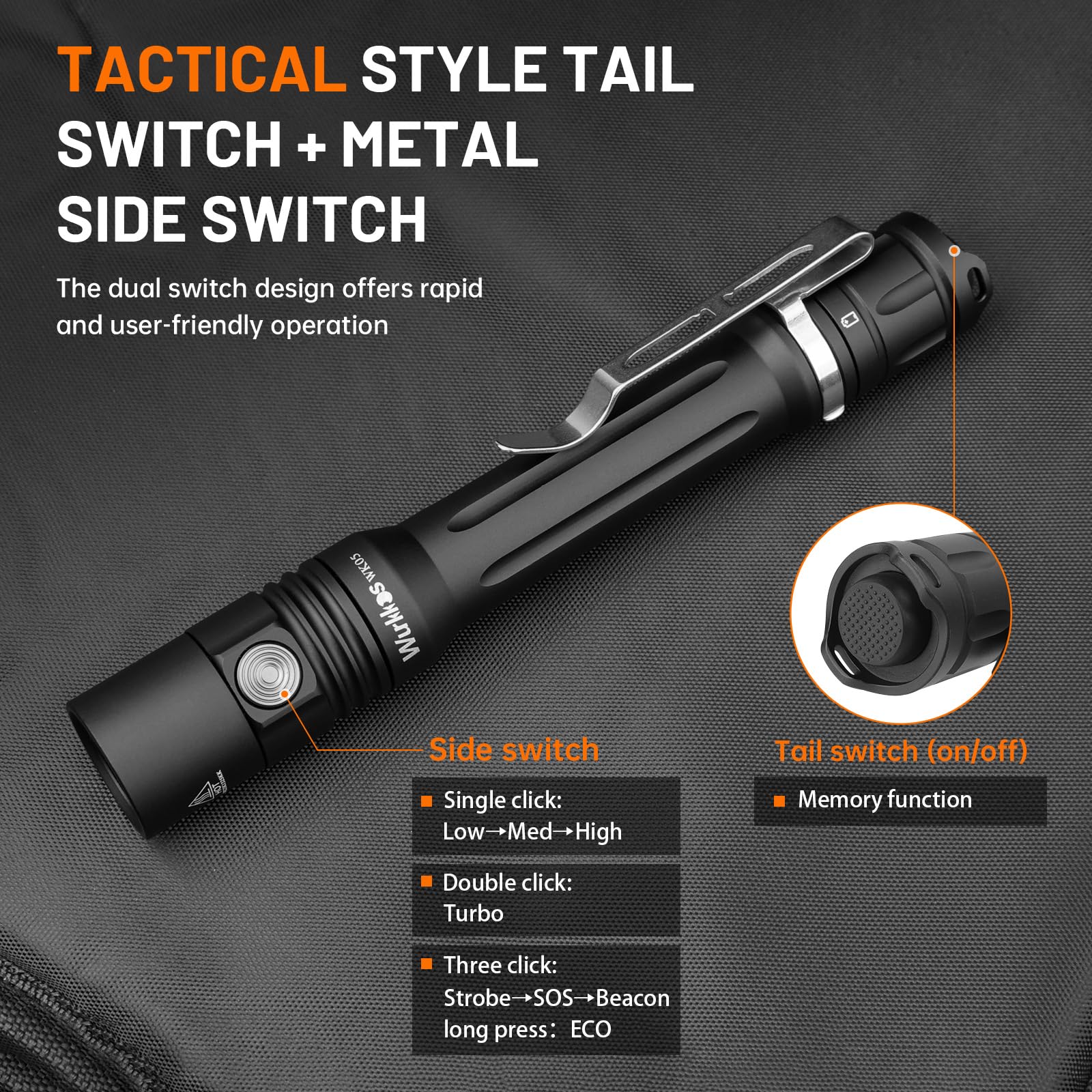 Conseils chauds : Ce modèle ne contient pas d'power AAA. Cliquer pour commuter la luminosité de la lampe de poche (Low-10LM → Med-100LM → High-500LM). 🔦DUAL SWITCH DESIGN : La lampe de poche WK05 est commandée par un interrupteur tactique à l'arrière et un interrupteur sur le côté pour la commande de l'éclairage. Double-clic pour activer le turbo (900LM). Wurkkos DL02 Lampe de Plongée, 3000 Lumen LED Lampe de poche Sous-marine Rechargeable, IPX8 étanche Lampe de plongée avec indicateur de puissance, pour grotte sous-marine de nuit L'interrupteur latéral a pour fonction de régler l'intensité lumineuse Wurkkos WK05 Lampe de poche AA Mini lampe de poche 900Lumen 519A Led haut CRI, IPX8 étanche double interrupteur flash extérieur La perle de lampe est composée de 519 A. 🔦Lampe de poche multifonctionnelle à interrupteur latéral : lorsqu'elle est allumée. 🔦L'alerte de faible puissance : en état allumé, si la lampe de poche LED WK05 détecte une tension inférieure à 6V. Le double interrupteur en saillie dans une combinaison de couleurs moderne anthracite gris clair se distingue par sa qualit sup rieure et sa garantie fabricant de 5 ans. Il est id al pour la restauration, les entrep ts, les garages ou les terrasses Après un test d'endurance de 1,5 mètre. La wurkkos WK05 est une lampe de poche stylo portable avec AAA. La perle de lampe est composée de 519 A. L'IRC ¿ 90 répond aux exigences d'un éclairage... Triple clic sur le bouton latéral pour accéder à Burst Flash, double clic sur le bouton pour accéder à SOS → Beacon → Burst Flash → Cycle Et toutes les deux minutes, la lumière principale clignotera 2 fois pour rappeler que la puissance est faible. L'interrupteur arrière a une fonction de mémoire. Lampe Marine Wurkkos WK05 Lampe De Poche AA Mini Lampe Flash La puissance lumineuse maximale est de 900 lumens.