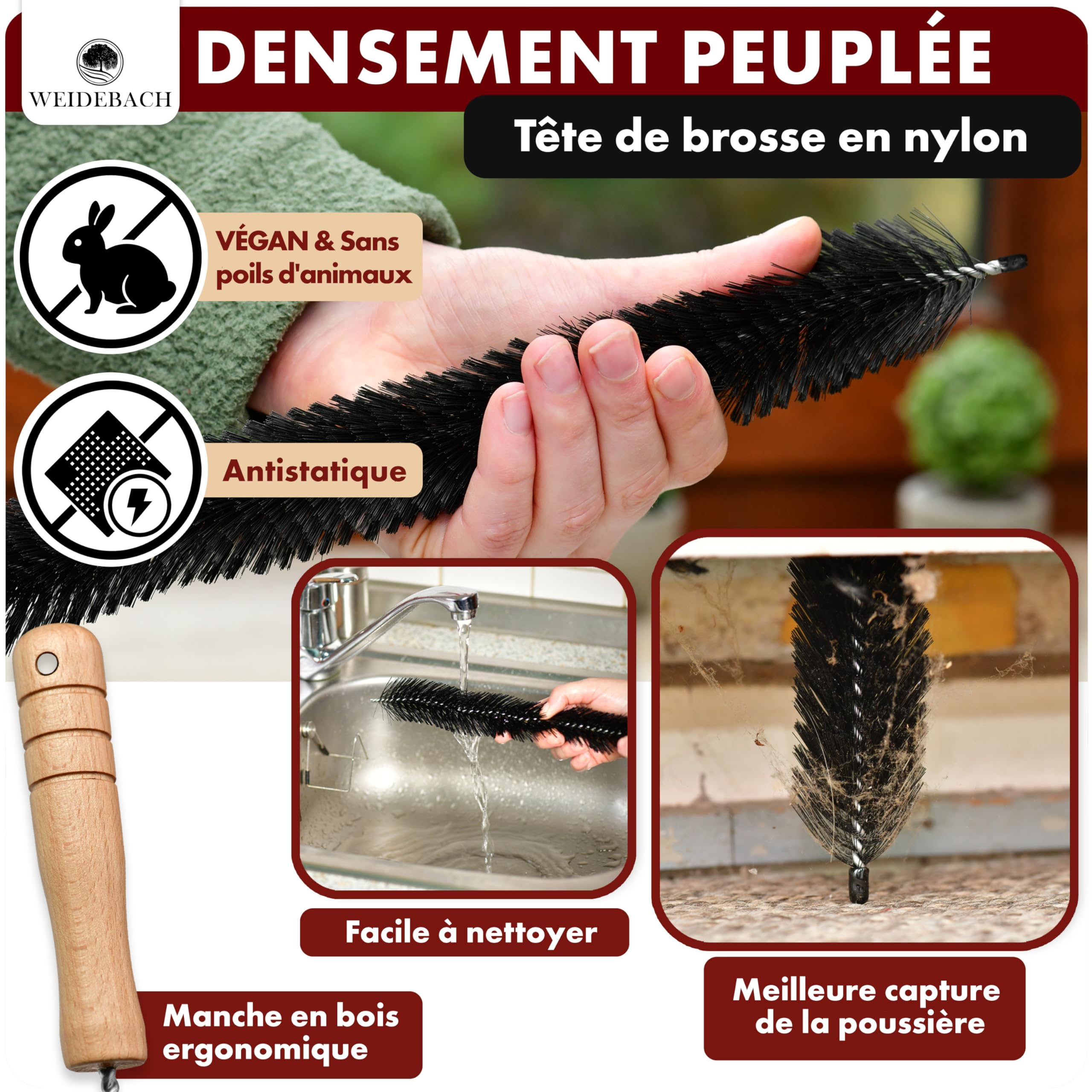 NETTOYAGE EN PROFONDEUR : vos radiateurs accumulent beaucoup de poussière et de saleté ? La brosse à radiateur WEIDEBACH en nylon vous permet de vous débarrasser des moindres grains de poussière, même dans les coins les plus inaccessibles. Brosse à radiateur naturelle Redecker | Savons & Chiffons Avec les brosses pour radiateur WEIDEBACH avec poils en microfibre, vous pouvez éliminer même le plus petit grain de poussière, même dans les coins les plus cachés Anti-rayures : la tige des brosses de nettoyage du radiateur WEIDEBACH est fabriquée en acier inoxydable et revêtue de caoutchouc Brosse Nettoyante Brosse à Radiateur WEIDEBACH 90cm - Nylon Sans Poils, Flexible Pour Brosse Pour Radiateur à Gaz Le manche garde sa forme solide, ce qui permet de nettoyer les saletés les plus tenaces. WEIDEBACH® Brosse À Radiateur 90cm De Long / 40cm De Brosse en Nylon, Sans Poils d'Animaux, Pour Atteindre Les Recoins, Stable Et Flexible90 cm. €8.47 au... ÉVITE LES RAYURES : la tige de la brosse de nettoyage pour radiateurs WEIDEBACH est faire d‘acier inoxydable et recouverte d'un revêtement en caoutchouc. STABLE ET FLEXIBLE À LA FOIS : La tige du bâton est très flexible, ce qui permet d'atteindre tous les coins. Vous pouvez nettoyer votre radiateur sans craindre les rayures sur la peinture du radiateur. WEIDEBACH® Brosse À Radiateur 125cm De Long / 75cm De Brosse en Nylon, Sans Poils d