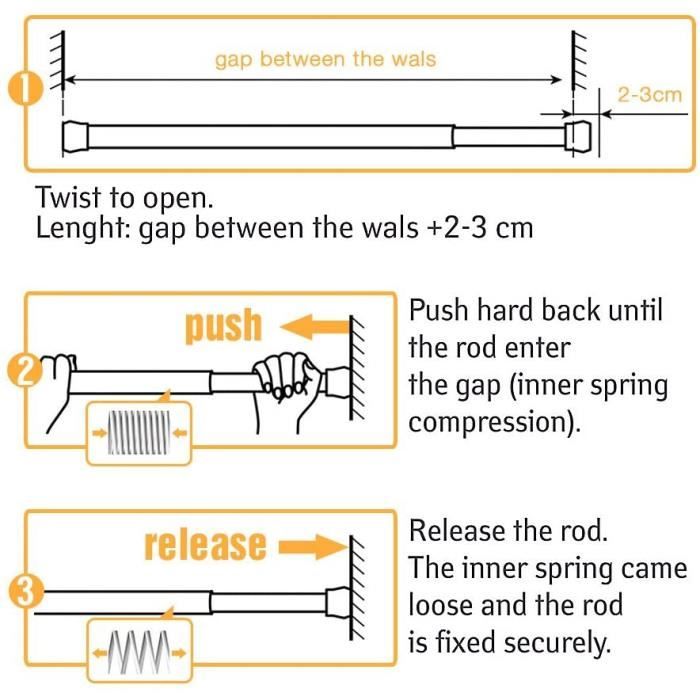 【Informations sur le produit】 Couleur : blanc | Taille : 30-50 cm Diamètre : 1,3 cm Capacité de charge : ≤ 1 kg Le paquet comprend : 4 x tige télescopique Matériau : fer + TPR 【Performance du produit】 ① Longueur réglable : 30 cm à 50 cm (environ) ②Longueur d'utilisation recommandée : 33 cm à 47 cm 【Utilisation du produit】 ①Utilisation : tringles de tension comme tringle à rideaux, tringle à vêtements, étagère à chaussures, cintres et plus encore. Large utilisation : la petite tringle à rideau peut être utilisée comme tringle à rideaux pour fenêtres étroites, fenêtres latérales, douches ou baignoires. La petite barre de serrage extensible est amovible en tournant légèrement. Tringle à rideaux à trous zonés, 210-260 cm, diamètre 25 mm, blanc... Double Tringle À Rideaux Or De 2.54Cm De Diamètre Pour Fenêtres De 122... Barre Extensible LC&TEAM Tige Télescopique 110-160cm Tringle à Rideau De Douche Sans Barre De Penderie Sans Percage ②Installation de la surface murale : mur de carreaux de céramique, mur de peinture en latex, mur de ciment, mur de chaux, mur en bois, verre trempé, surface métallique, mur rugueux. Lot de 6 Tringles à Rideaux,Télescopique Tringle à Rideau,Extensible La tringle télescopique à clipser peut également être utilisée pour les armoires, les dressings et les bibliothèques. Haute qualité : la petite tringle extensible est une barre métallique avec deux extrémités en caoutchouc, un ressort épais intégré et une technologie de pulvérisation électrostatique qui peut empêcher la rouille. Durable, léger et stable : il est recommandé de mesurer la longueur du lieu d'installation avant l'achat.
