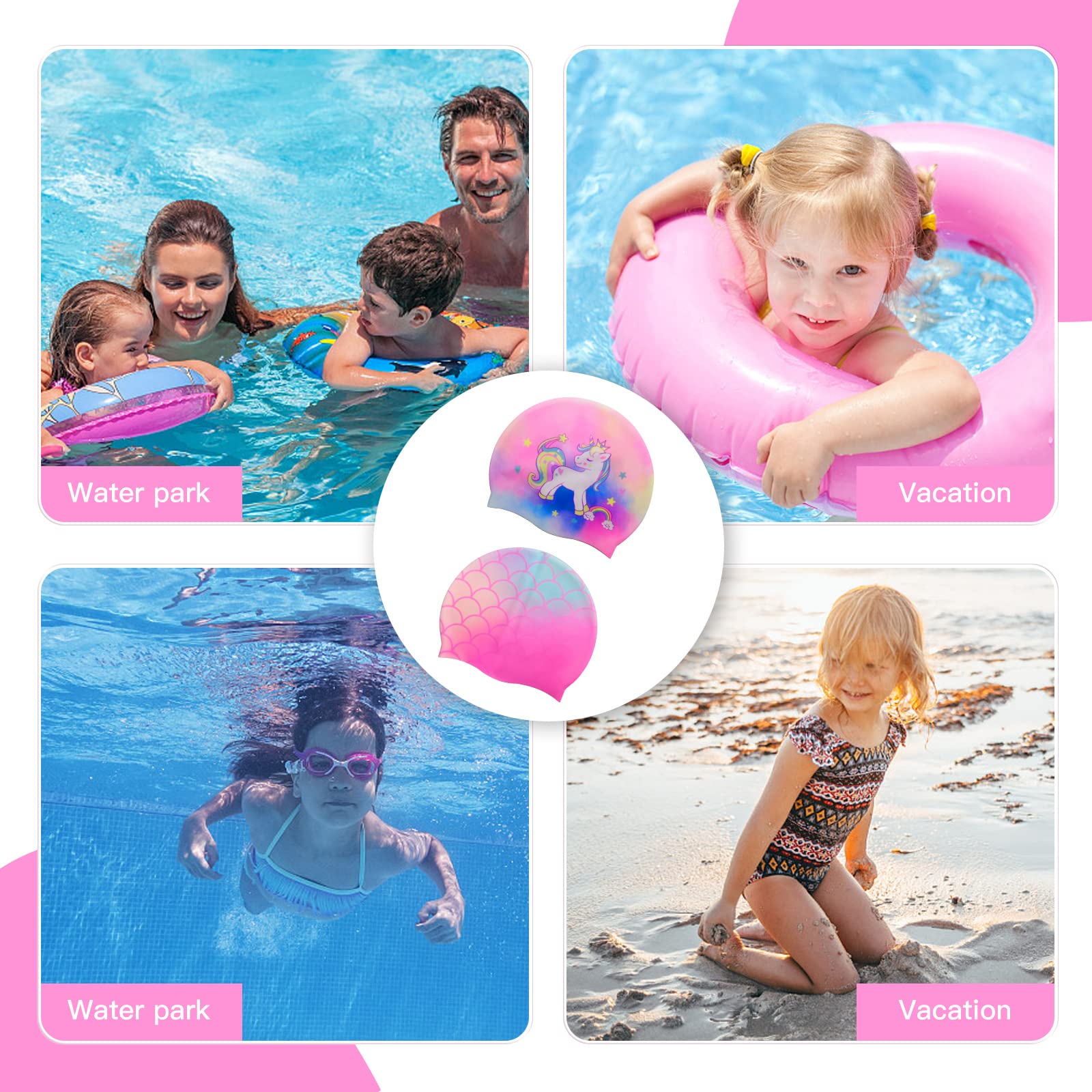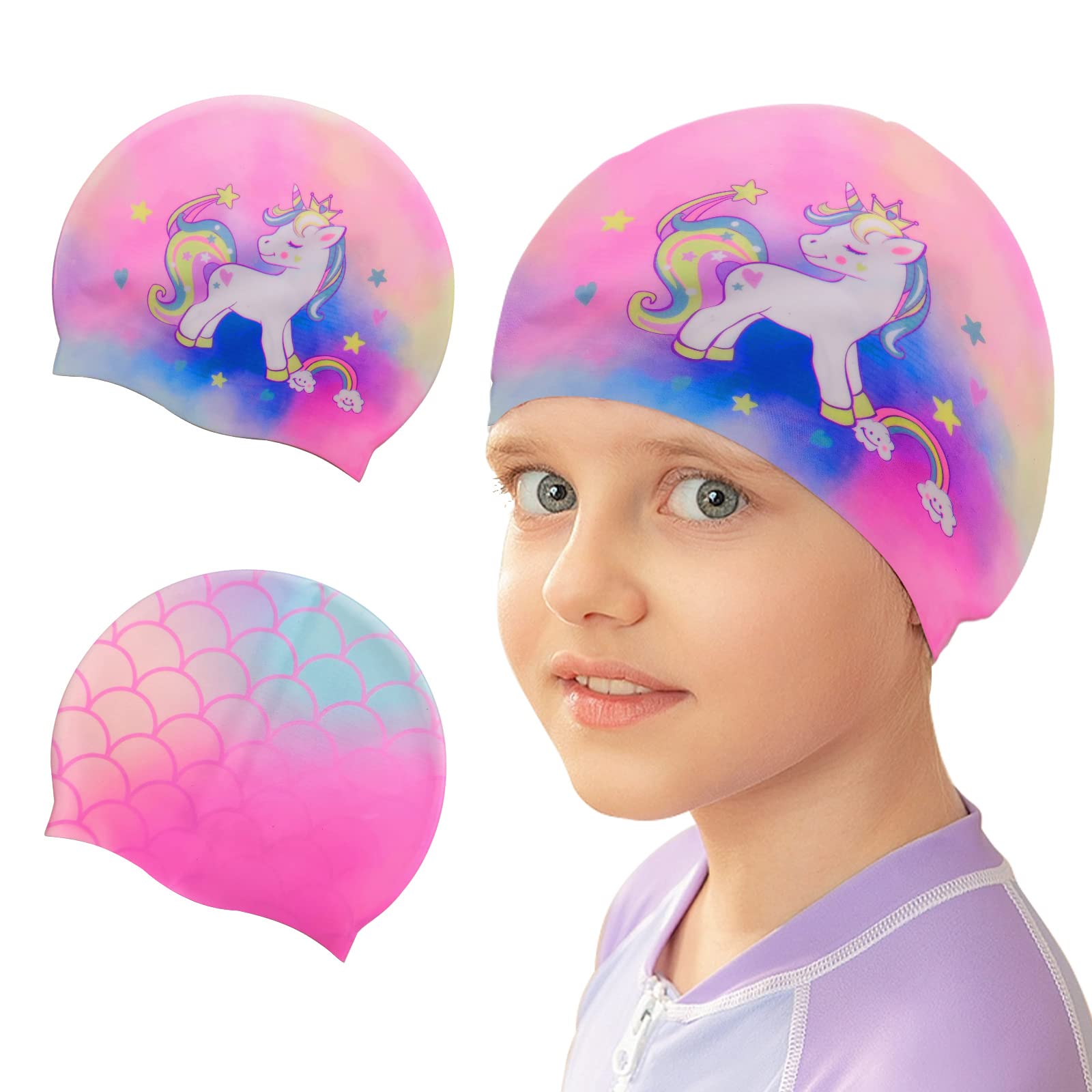 1., Le bonnet de bain pour enfants a 2 jolis motifs de dessin animé, licornes et sirènes., 2., Facile à utiliser, il suffit de l'étirer, de le mettre et de s'amuser., 3., Fabriqué en silicone, imperméable, garde les cheveux secs. Haute élasticité : nos bonnets de bain pour enfants ont une grande élasticité pour offrir un ajustement confortable et confortable sans se sentir trop serré ou se desserrer facilement. Notre design de bonnet de bain rend les nageurs plus visibles dans une foule, ce qui rend la visibilité supplémentaire pour les parents ou les tuteurs. Ensemble d'une pièce de tissu imprimé de dessins animés pour garçons et filles, avec des protecteurs d'oreille mignons et confortables et un design antidérapant pour les bonnets de bain et les casques de plongée pour enfants Fabricants, fournisseurs et usines de claviers en caoutchouc de... Bonnet De Bain Enfant,2 Pièces Silicone Imperméable Bonnet Design charmant : vous recevrez 2 bonnets de bain pour enfants, y compris licorne et sirène. Fabricants, fournisseurs et usines de claviers en caoutchouc de Il est facile à mettre et à enlever sans tirer les cheveux, assurant un ajustement sûr et confortable pendant la natation. Confortable et durable : les bonnets de bain pour filles sont fabriqués en silicone de haute qualité, doux au toucher, séchage rapide et sans plis. Imperméable et pratique : le bonnet de natation pour enfants est imperméable et garantit que les cheveux de votre enfant sont maintenus en place en toute sécurité pendant la natation et que les cheveux restent secs.