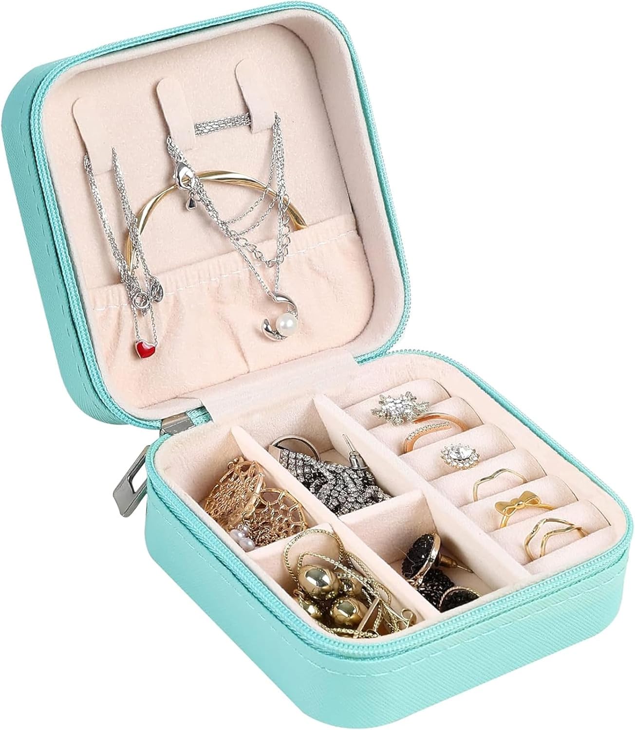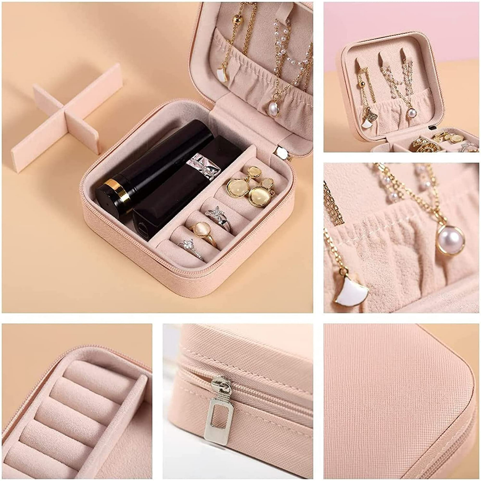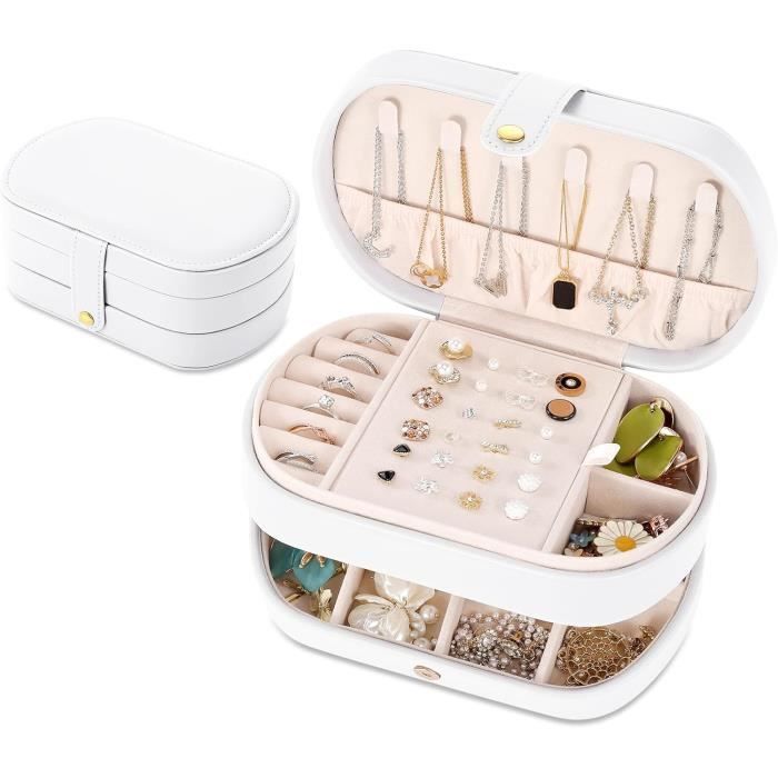 L'intérieur est doublé de velours doux pour protéger vos bijoux des rayures et des dommages. Il protège également vos bijoux contre les dommages causés par les dommages à la maison ou en voyage. PANDORA Boîte à bijoux originale pour fee et fille Boîte à bijoux de... Gardez vos bijoux une vie longue et heureuse avec ce superbe rangement de bijoux. Compartiments souples pour anneaux Dans la partie inférieure se trouvent 8 compartiments souples pour les bagues. Taille et portabilité parfaites : cette mini boîte à bijoux est à la fois robuste et charmante. Intérieur personnalisable La couche mobile DIY contient 2 séparateurs amovibles. Avec son design simple et élégant, c'est le cadeau parfait pour les mères, épouses, petites amies, filles, amis, collègues et toutes les femmes et les filles. 【Qualité supérieure】 L'extérieur du rangement de bijoux de voyage est en cuir synthétique durable et imperméable, facile à nettoyer. Fonction multiple: cette boîte à bijoux est idéale pour ranger vos bagues, boucles d'oreilles, colliers, bracelets, montres et pinces à cheveux. Cette boîte de... (Veuillez noter que les bijoux ne sont pas inclus dans la livraison) Rangement Pour Bijoux En Bois Mini Coffret Mini Boîte à Bijoux Velours 10x10x5cm - Organisateur Voyage - 6 Crochets Boucles D'oreilles Anneau - Fermeture Zippée Rangement Bijoux Voyage Boite à Bijoux De Voyage La partie supérieure dispose de 5 crochets et d'une poche élastique pour ranger les colliers et les bracelets en toute sécurité et protéger les bijoux contre les dommages et le désordre. 5 crochets pour colliers Le couvercle supérieur est équipé de 5 crochets pour colliers et pendentifs, une poche élastique maintient les chaînes en place et les empêche de s'emmêler. Vous pouvez facilement le ranger dans votre sac à main, votre valise ou vos bagages lorsque vous êtes en voyage, y compris les longues vacances, les courts week-ends, les voyages d'affaires ou même lorsque vous allez à la salle de sport ou au yoga. Rangement de bijoux multifonction : cette boîte à bijoux à deux couches, bien que petite, offre beaucoup d'espace de rangement. Larko Boite a Bijoux Femme Fille Enfant, Boîte à Bijoux Voyage Petite