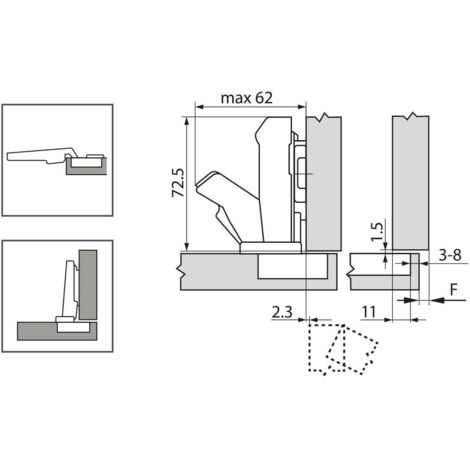 Charnière entièrement en métal. - Angle d'ouverture : 110°. - Avec réglage confortable de la profondeur via vis filetée. - Avec ou sans fermeture automatique (ressort). - Montage et démontage sans outils de la porte sur le corps. - Réglage en 3 dimensions. - Angle d'ouverture : 110 °. - Type de butée : butée d'angle. - Surface Cette flexibilité d'utilisation permet un ajustement optimal, assurant ainsi une performance constante sur le long terme. - Type : clip supérieur BLUMOTION - Type de butée : butée d'angle. - Compatible avec les plaques de montage à clip supérieur. Sa conception permet de maintenir une esthétique soignée tout en offrant une excellente durabilité et résistance à l'usage quotidien. Charniere Invisible Blum Clip Top Pas Cher - Meilleures Ofes Black Iday 2025 Blum Clip Top Charnière - Marque : Blum - Contenu (ST) : 1 Caractéristique technique : Ouverture : 110° - Surface : nickelée. - Montage et démontage sans outils de la porte sur le corps. Charnière de meuble de haute qualité et durable en acier robuste. Ferme Porte BLUM Clip Top Blumotion Charnière Droite à 110° Avec Ressort Inserta Charniere... - Réglage en 3 dimensions. - Utilisation : charnière standard., - Courbure (mm) : 0., - Type de montage : Inserta. - Modèle : avec ressort. Charnière de meuble BLUM Clip Top Blumotion 110° droite avec insert à ressort , Marque: Blum Blum Lot de 8 charnières Blumotion à fermeture amortie à 110 degrés, fermeture automatique, cadre frontal, avec plaques de montage (complet – superposition – Lot de 8