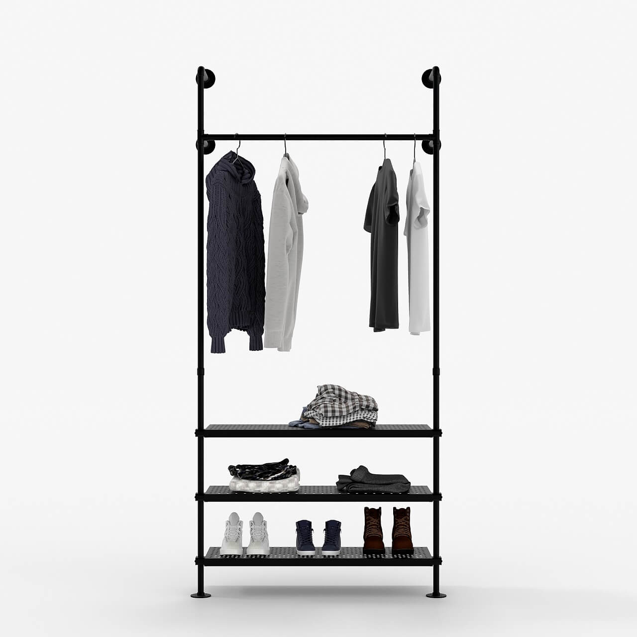 Les tubes métalliques solides sont extrêmement résistants. Pamo Tringle à Vêtements Au Design Industriel | HEDDA | Avec La stabilité de la tringle à vêtements est remarquable et permet de sécuriser l'étagère métallique noire d'un grand nombre de vêtements. Notre tringle à vêtements noire en tubes d'eau est le choix parfait pour tous ceux qui sont à la recherche d'un système de rangement de vêtements robuste et flexible, qui peut également être utilisé comme étagère à chaussures étroite. Fabriquée en tubes d'acier massif avec finition noire mate anti-rayures, elle apporte une touche d'originalité à votre intérieur - chambre, dressing, salle de... Simple - Grâce aux patins en feutre antidérapants, aucune fixation au sol n'est nécessaire. Variable et bien pensé - Les dimensions offrent une grande liberté de création. pamo Tringle à vêtements design industriel avec planches en chêne – OSKAR – Armoire et penderie murale – Porte-manteau en tubes noirs solides pour montage... Nos étagères métalliques à usage variable pour les rayonnages sont la solution parfaite pour une utilisation optimale de l'espace de rangement. Le revêtement en poudre noir mat confère à l'étagère murale en métal noir un aspect élégant et assure en même temps une protection supplémentaire contre les rayures et l'usure. pamo Tringles à vêtements autoportantes design loft industriel - LAS Grâce à sa structure variable, la tringle à vêtements peut être installée de manière flexible et sans fixation au sol, ce qui permet un montage simple et rapide. Ils sont robustes et ne fléchissent pas, même sous une charge élevée. Haute qualité et longue durée de vie - Les tablettes métalliques peintes par poudrage s'adaptent à tous les types de sols et conviennent à tous les styles d'intérieur. Les étagères métalliques peuvent être déplacées en hauteur. Ainsi, votre portemanteau à charge lourde devient une armoire ouverte.