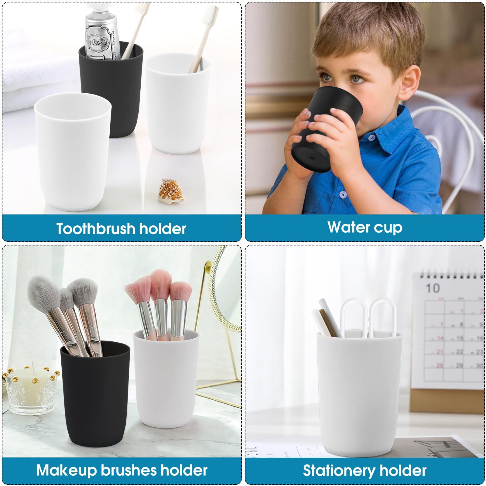 Les ensembles sont vendus individuellement en noir et gris. 280 ml - Capacité : Suffisamment d'espace pour vos boissons préférées. Parfait pour un usage quotidien - Pratique et polyvalent. Utilisation polyvalente : non seulement comme gobelet à brosse à dents, mais également comme support pour dentifrice et brosses à dents. Nos gobelets à dents de qualité supérieure sont spécialement conçus pour les enfants et polyvalents. Le matériau léger permet une prise en main facile sans risque de bris de verre. Design peu encombrant : Les gobelets empilables en plastique sont non seulement pratiques, mais aussi parfaits pour les voyages, les bagages ou le camping. Le gobelet de brosse à dents Nuscen est non seulement une alternative durable aux verres jetables, mais aussi un ajout coloré à votre usage quotidien. Design peu encombrant : les gobelets empilables en plastique sont non seulement pratiques et pratiques à ranger, mais sont également parfaits pour les déplacements. Description du produit Nuscen Set de gobelets à dents Gobelet à dents en plastique Présentation du produit : Nuscen Lot de 4 verres à dents de qualité supérieure Bienvenue chez Nuscen, où qualité, fonctionnalité et durabilité se rencontrent ! Usage quotidien Premium Material: Fabriqués en polypropylène de qualité alimentaire, nos gobelets à brosse à dents sont exempts d'ingrédients toxiques et de BPA. Vente individuelle : Les ensembles sont vendus individuellement en noir et gris. Kit manche brosse à dents en bois 3 têtes rechargeables - La Maline - My 365 Spécialement conçus pour les enfants, nos gobelets à dents de qualité supérieure offrent non seulement un rangement sûr, mais sont également polyvalents. Gobelet Et Porte Brosse À Dents En Résine Striée Noir Mat... Nuscen Lot De 4 Gobelets à Brosse à Dents En Plastique De Qualité Facile à nettoyer : Lavable en machine pour un entretien facile. Taille parfaite : avec un diamètre d'ouverture de 7 cm et une hauteur de 9,7 cm, les gobelets peuvent contenir jusqu'à 280 ml de vos boissons préférées. Parfait pour les voyages, le camping et les barbecues en plein air. Avec Nuscen, le soin dentaire est amusant Robuste et durable : Malgré les exigences d'une utilisation quotidienne. Assez de tasses de salle de bain, de sorte que ces tasses de salle de bain peuvent répondre à vos différents besoins, et adaptées pour un usage familial. - Les gobelets de salle de bain réutilisables sont fabriqués en plastique fiable, support de brosse à dents facile à nettoyer Bord extérieur lisse : Confortablement lisse et sans danger pour les lèvres. Apportez une touche d'élégance à votre salle de bain avec ce gobelet pratique. Utilisation polyvalente : Il peut non seulement servir de gobelet à brosse à dents, mais aussi de support pour dentifrice et brosses à dents. La fonction anti-chute le rend réutilisable et lavable en machine, tandis que le design peu encombrant le rend parfait pour les voyages, le camping ou le stockage dans les bagages. Gobelet de secours pour invités : Pratique pour les visites inattendues. L'ensemble comprend quatre couleurs fraîches – bleu, vert, rose et gris – et peut également être acheté séparément en noir et gris. Matériau léger : Facile à tenir sans risque de bris de verre. Ces tasses exclusives pour les membres de la famille augmentent le plaisir de la vie quotidienne et peuvent également être utilisées comme gobelets de secours pour les invités. Gobelet froid : Parfait pour l'eau, le froid, le lait, le jus et le soda.