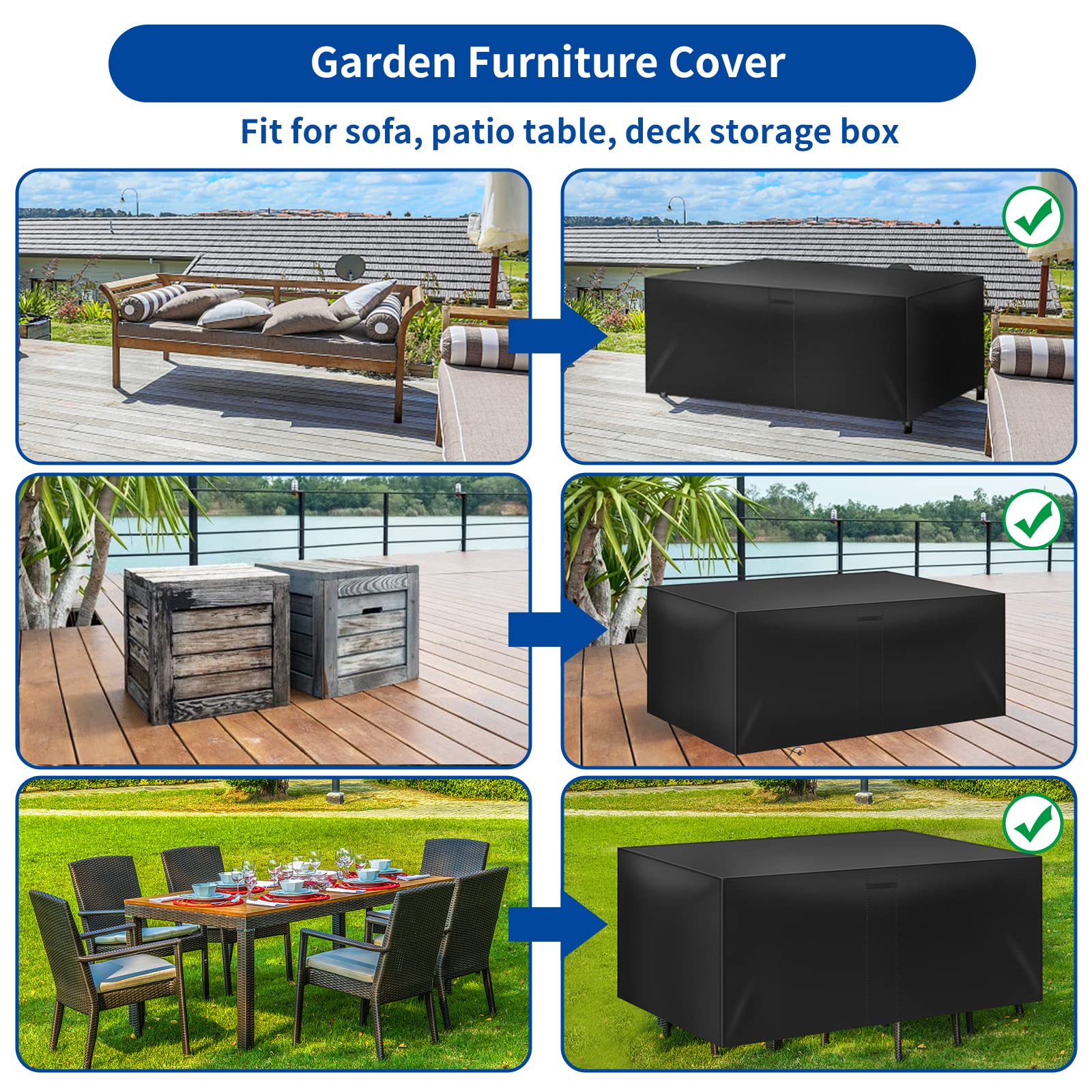 imperméable, anti-UV, anti-déchiré et, ce qui protège efficacement vos meubles de la pluie, de la neige, du gel, du soleil, du vent, la sève des arbres,la saleté, de la poussière et d'autres influences. Rappel Chaleureux: réduire l'accumulation d'eau de pluie sur le couvercle de protection peut prolonger efficacement la durée de vie du couvercle de protection. Performances : imperméable, coupe-vent, anti-poussière, résistant aux UV. La housse de mobilier de jardin haut de gamme en tissu Oxford résistant et non décoloré est imperméable et déchirure permanente. Elle offre une durabilité exceptionnelle contre la lumière du soleil et protège votre cha et votre table en toutes saisons Comment utiliser correctement la housse de meuble. La housse de meuble étanche et résistante a plusieurs fonctions de protection, protège vos meubles de toutes les conditions météorologiques, afin que vous puissiez profiter de votre temps libre à l'extérieur. Placez des objets légèrement plus hauts sous le couvercle de la table pour soutenir la partie centrale, de sorte que l'eau et les débris puissent s'écouler vers le bas. 【Double protection coupe-vent】 Le fond des Housse Salon de Jardin de jardin est doté d'un cordon de serrage et de 4 boucles. 120x60x90cm/LxWxH. 28,99 € ; 120x90x70cm/LxWxH. 27,59 € ; 120x94x84cm/LxWxH. 29,79 € ; 120x110x90cm/LxWxH. 34,59 € ; 120x120x75cm/LxWxH. 31,89... 【Housse Imperméable de Salons de Jardin】Cette Housse Table de Jardin est en tissu oxford 420D a une meilleure résistance aux intempéries et résistance à la chaleur, parfaite pour protéger un salon extérieur de jardin. Empêche la chute des feuilles, la neige et l'humiditéApplicable à: toutes sortes de meubles d'intérieur et d'extérieurCaractéristiques:-Fabriqué en matériau incroyablement hydrophobe et à double bordure, le couvre-fissures offre une protection complète. Veuillez vérifier la taille du meuble avant de commander afin de pouvoir choisir une taille plus appropriée pour votre housse de meuble. offrent une protection toute l'année pour votre meubles extérieur. Housse Salon De Jardin Exterieur,120x90x70cm (LxWxH) Mobilier De Jardin Le cordon élastique à l'ourlet permet de l'ajuster qui peuvent fixer vos meubles d'amour plus parfaitement et prévenir efficacement les intempéries. Vous avez juste besoin d'un tuyau d'eau pour rincer et simplement sécher au soleil, Ou utilisez un chiffon de nettoyage. Lors de l'installation, il vous suffit d'ouvrir le couvercle extérieur et de fixer le ruban d'étanchéité et de le verrouiller sur les pieds de support du meuble pour le rendre stable. YUSUZHU Housse Salon de Jardin Exterieur,120x90x70cm (LxWxH Spécifications du produit:Nom: Housse Salon de JardinCouleur: noir,argentMatériau : polyester oxford 420D haute densité + revêtement argenté. ne sera pas emporté par le vent. -Cordon de serrage et boucles réglables,la bâche de protection pour meubles de jardin ne sera pas soufflée par le vent. Avec la housse de meubles de jardin de qualité supérieure de, vous pouvez garder vos meubles de jardin beaux et secs à tout moment. 📨 XIANGPEIFBH est une marque dédiée à fournir aux clients des produits de haute qualité.