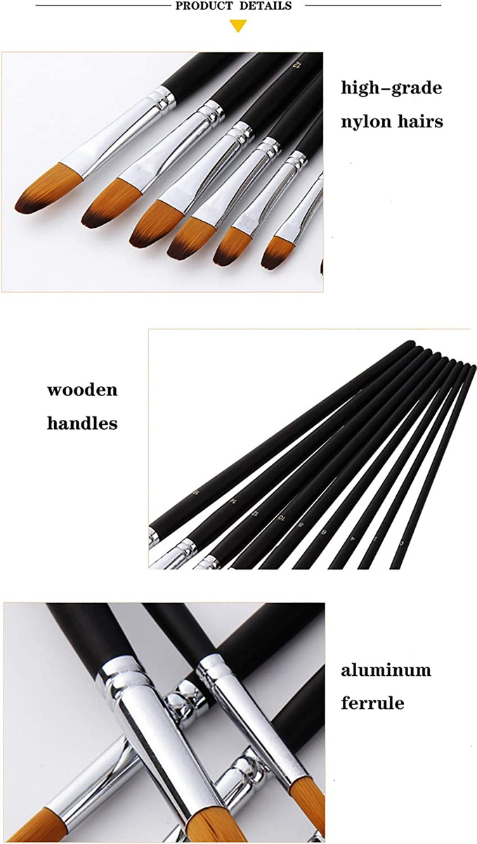Grâce au nylon Toray de qualité supérieure, les pinceaux ont une excellente durabilité et une grande élasticité. 9 pinceaux haute qualité en toray - Bout langue de chat, poils synthétiques dorés haute qualité Conviennent pour peinture acrylique et peinture aquarelle - Haute résistance Paint Brush Filbert es Set, 9 Pcs Professional Artist Brush For Buy GETHPEN Filbert Paint Brushes Set, 12 PCS Artist Brush For Acrylic Oil Watercolor Gouache Artist Professional Painting Kits With Synthetic Nylon Tips... Pinceau Nylon Set Of 9 Paintbrushes - Filbert / Bevelled / Toray - For Watercolour / Acrylic Painting Pinceau Nylon Peinture Numero Grande élasticité, longue durée de vie, nettoyage facile