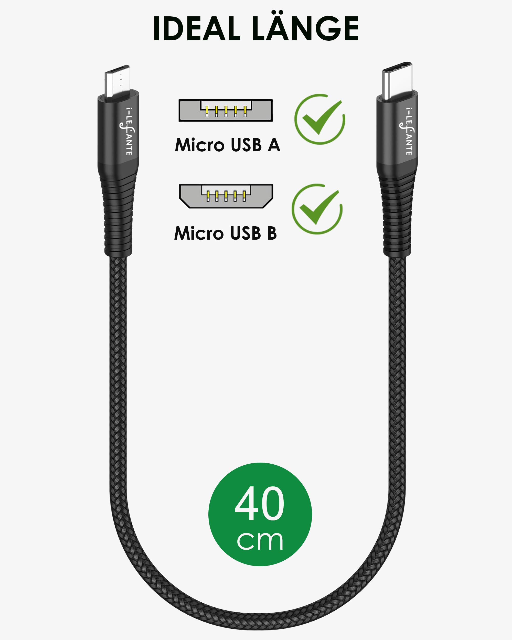 Câble de connexion USB OTG de 0,3 mètre - câble USB MICRO vers MICRO USB - de PAXO ! Gaine en tissu ELEGANTE et ROBUSTE, blindage intérieur et connecteurs moulés stables. Si le câble est branché dans un appareil avec les broches ou le bord le plus long vers le haut, alors le câble part vers la gauche. Les câbles de connexion USB robustes de PAXO conviennent parfaitement pour connecter des appareils dotés de prises USB MICRO (tablettes, appareils photo, téléphones, etc.) à des périphériques USB MICRO de type USB 2.0 Micro USB Femelle Coudée 1050171001 Molex Contenu: 1 pc(s) R797512 Bosch Nyon MICRO USB 2.0 Gauche Coudée 90° Connecteur Coudé Adaptateur Données & Câble 27cm EUR 14,06 Cable Micro Usb Vers Micro Usb Comme la prise USB du Bosch Intuvia, par exemple, est inversée, il faut prendre la fiche Micro USB , 2., micro USB (consommateur / appareil) - 90° GAUCHE : la fiche micro USB part du câble à gauche lorsque les broches sont orientées vers le haut. eBike USB charging cable Micro A - Micro B Intuvia/Nyon/Kiox Livraison : câble de connexion USB de 0,3m, micro USB mâle vers micro USB mâle en noir. TRANSMISSION DE DONNÉES SUPER RAPIDE et CHARGE RAPIDE grâce à la très grande section du câble (AWG24 standard). +++ GARANTIE SANS REMBOURSEMENT +++ SERVICE CLIENT : help@lugium.