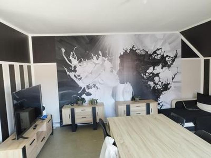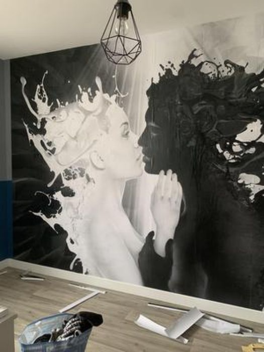 INSTALLATION: très facile à poser. Appliquez de la colle sur le mur, appuyez le papier peint sec sur le mur et vous avez terminé! Pas de cloques, pas de pliures